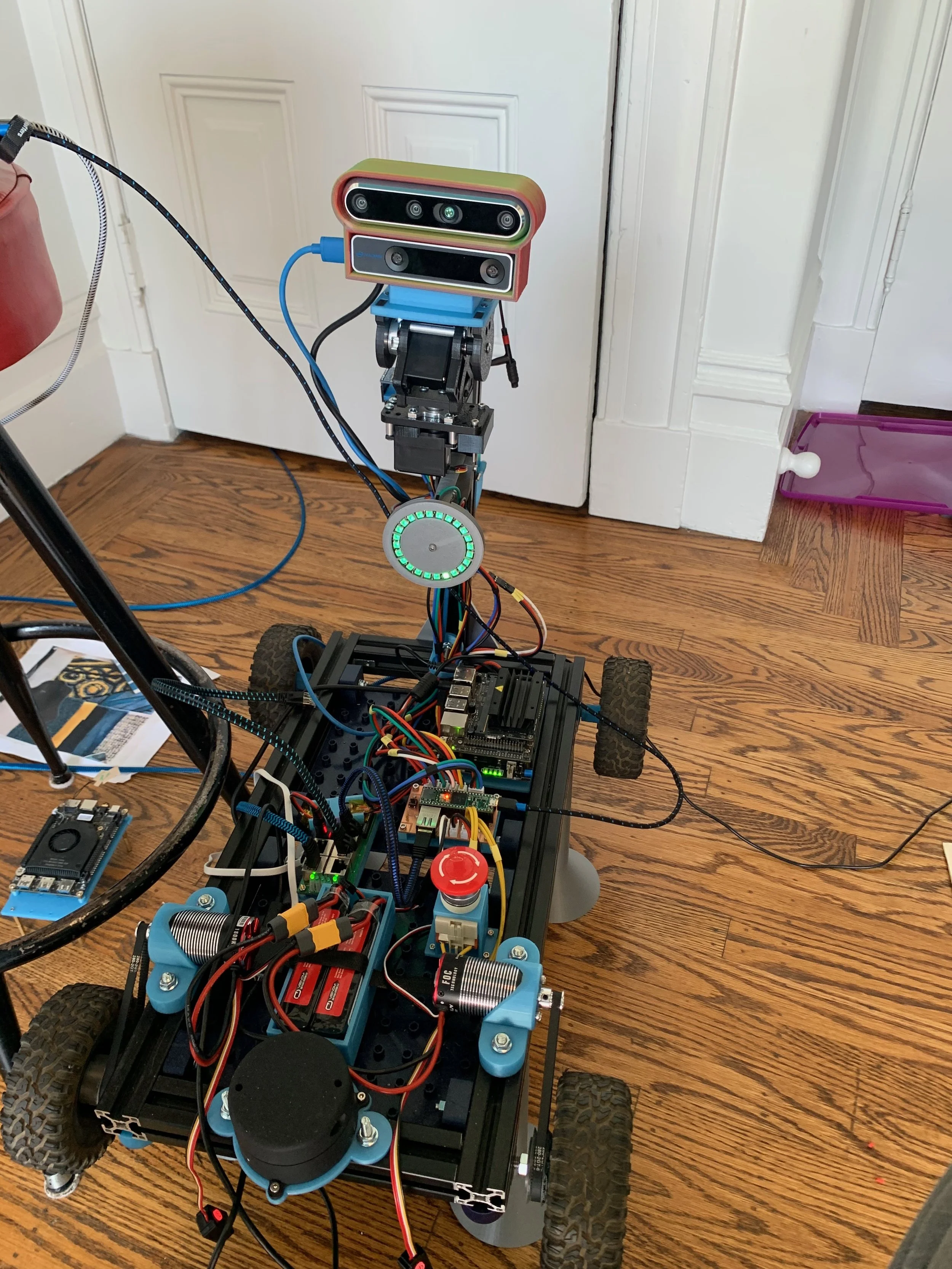 Let’s call this one overdone. I wanted to create plenty of space for hardware and this ended up causing way too many issues. I tried to cram too much on this one: For compute, I included a Jetson Nano, Latte Panda Alpha, and a Teensy Microcontroller on a home etched PCB board all networked together. I (incorrectly) thought I needed all this computing power but instead ended up with a complicated mess. I was still using RC motors, though slightly simplified with a built in ESC. In addition to this being overly complex, this thing was heavy which meant that the differential drive wasn’t able to turn the robot. Lessons learned: Start simple and stick with a single computer